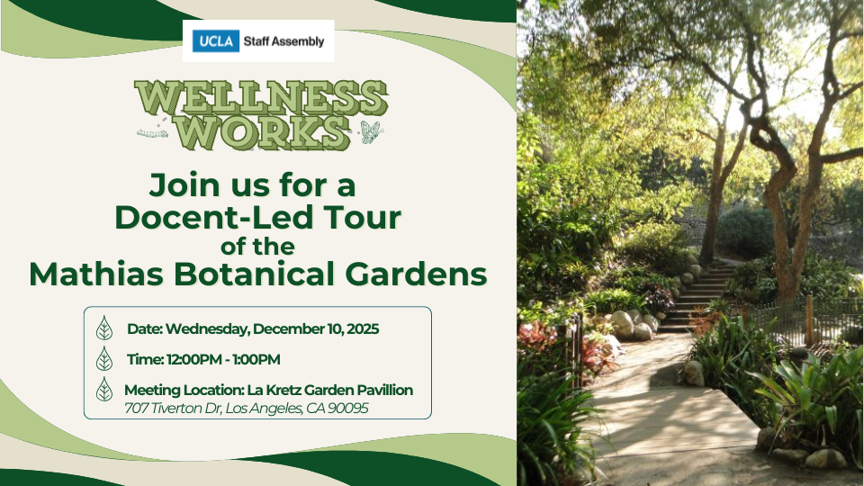 Welcome to the Staff Assembly Wellness Works Program! Join us for a relaxing afternoon at the UCLA Mathias Botanical Garden on December 10, 2025 at 12:00 PM (Pacific Time). Take a break from your busy day and immerse yourself in the beauty of nature with Docent-Led Botanical Garden Tours. Let our knowledgeable guides lead you through the diverse plant collections while sharing interesting insights. Don’t miss this opportunity to unwind and connect with nature!