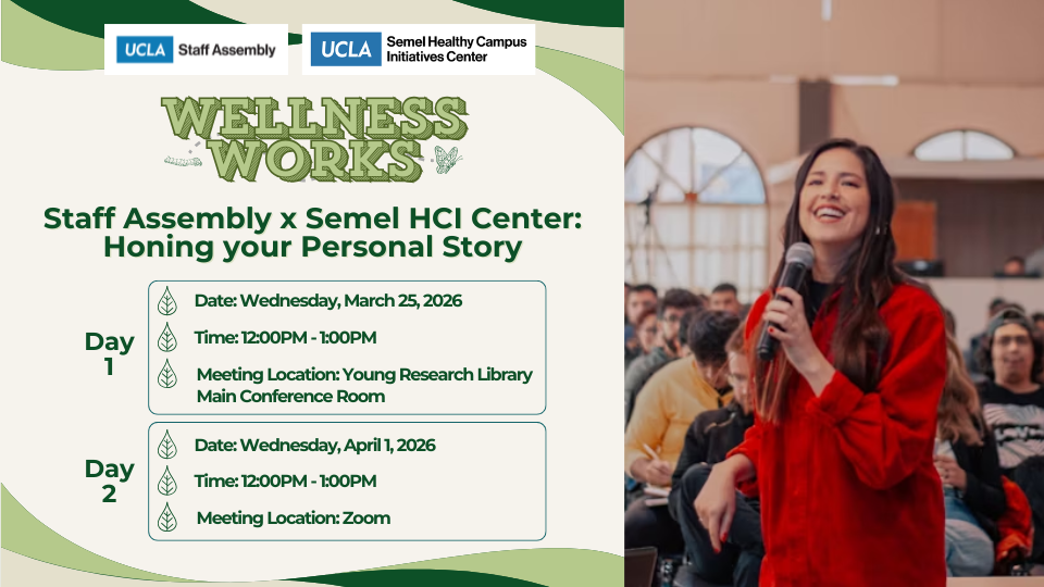 Join UCLA Staff Assembly in collaboration with the Semel Healthy Campus Initiatives Center for an engaging two-part workshop exploring how faculty and staff can craft stories that resonate. Led by UCLA storytelling professionals, playful prompts and exercises will guide participants in clarifying their narrative voice and identifying defining moments for presentations, leadership, teaching, or personal growth. The following week, you’ll have the optional opportunity to share your draft, celebrate your progress.