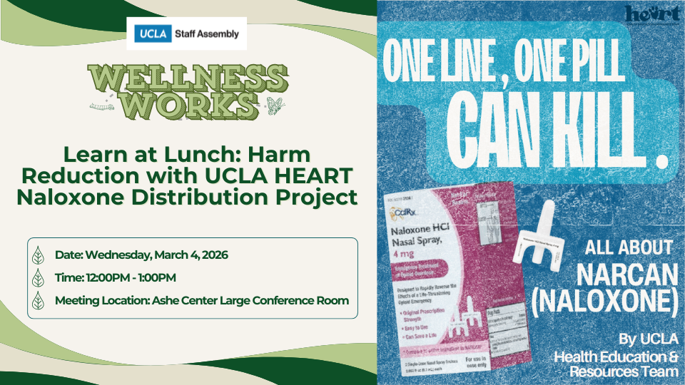 Join Staff Assembly for a Wellness Works Learn at Lunch session in partnership with the UCLA Health Education and Resource Team (HEART) Naloxone Distribution team.